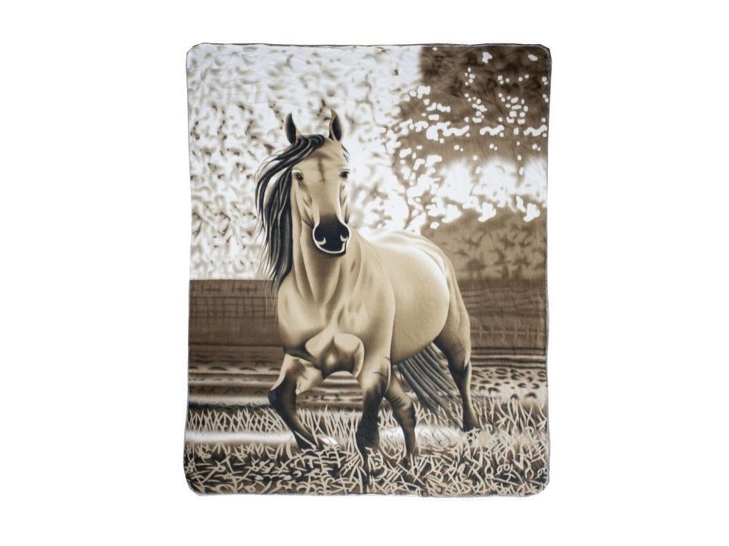 Krásná, lehká, teplá, flaušová deka s motivem koně ve výběhu¨ rozměr 150 x 190 cm barva hnědo-béžová