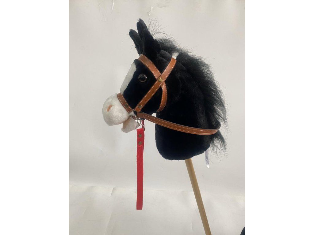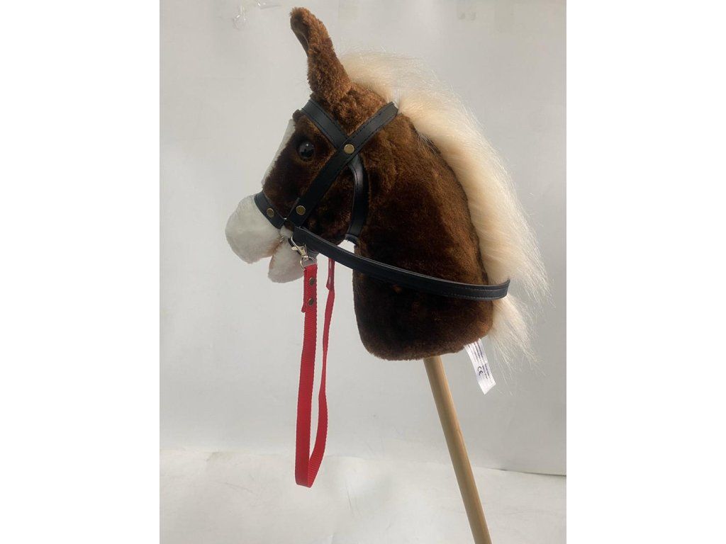 Celková délka 94 cm, kůň je dodáván s uzdečkou a otěží a volným červeným lanem. Hlava ušita z příjemného plyše, dřevěná tyčka.