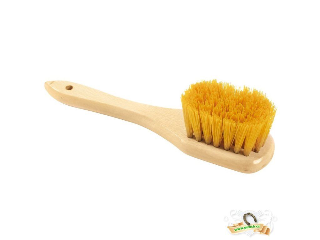 Dlouhá dřevěná ručka pro pohodlné umývání kopyt, syntetické tužší štětiny, barva žlutá. Dlouhý 24 cm, štětiny vysoké 4 cm.