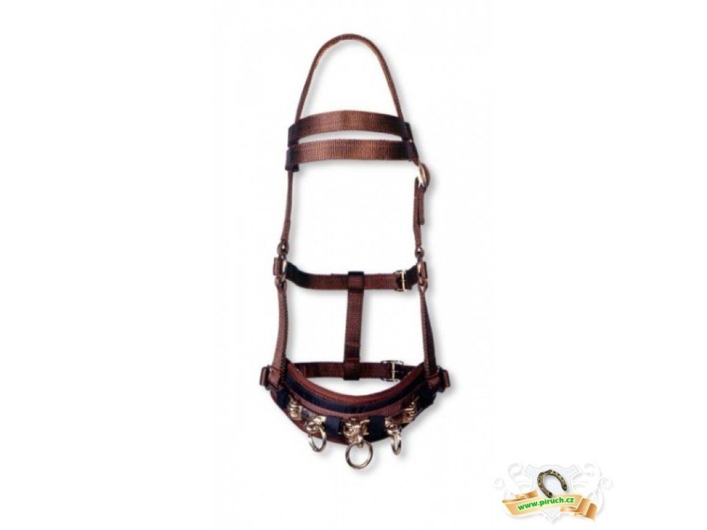 Z pevného nylonu, tři otočné kroužky na nánosníku, dvě vyměnitelné čelenky Cob a full v jedné nastavitelné velikosti, barva hnědá