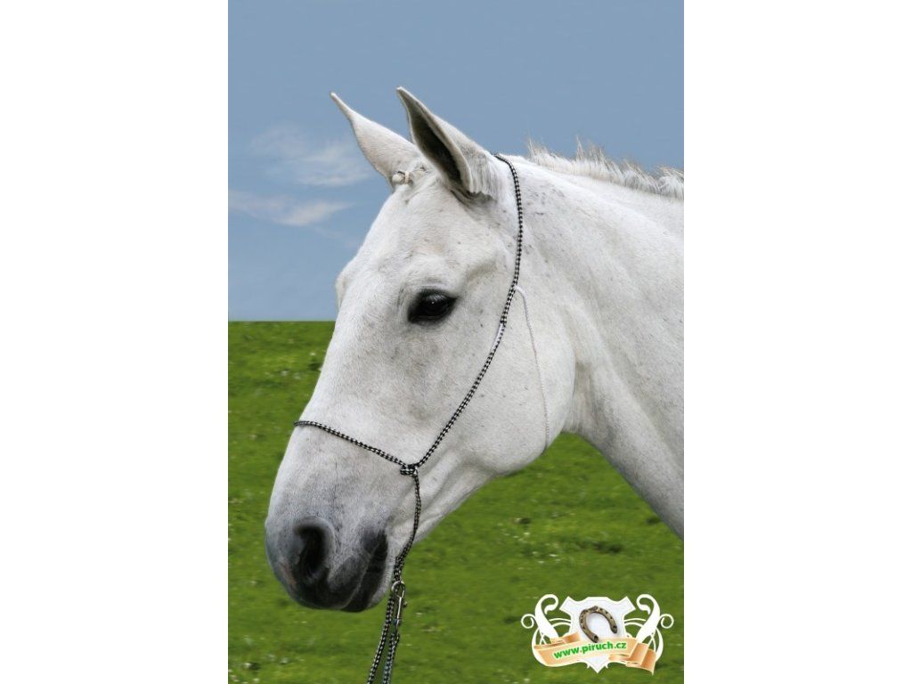 Vandrovní, nylonová, velmi jednoduše upravitelná na jakéhokoli koně, lehká, na konci karabina, jedna velikost, barva bílo - černá