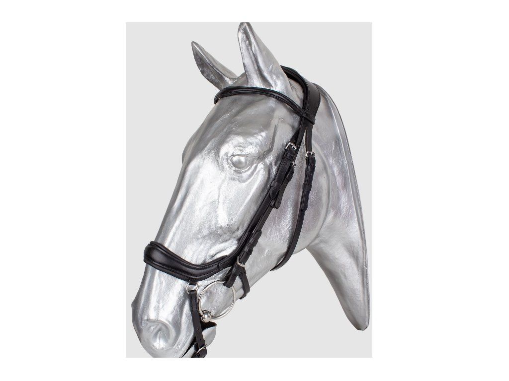 Speciální anatomická celokožená uzdečka s tvarovaným nánosníkem, extra vypodložený nátylník umožňuje větší volnost pro pohyb uší. Dodáváno včetně plátěných otěží se zarážkami.