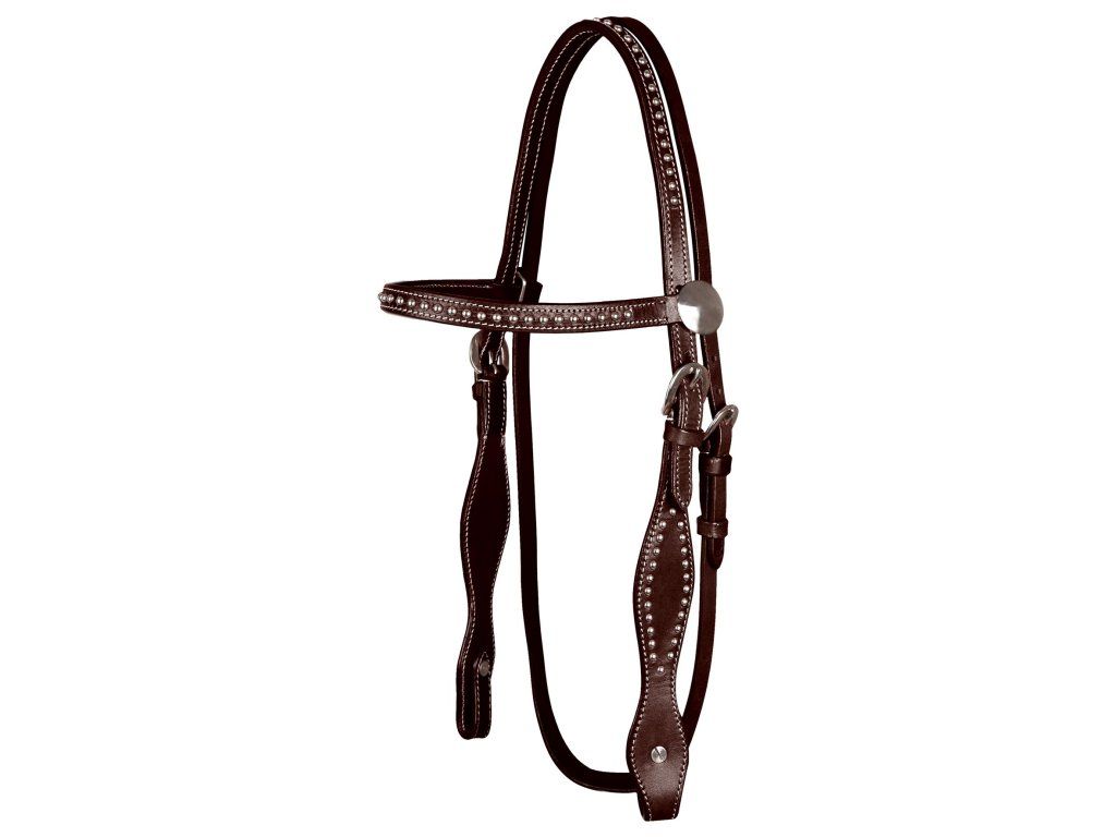 Elegantní westernová uzdečka z kvalitní kůže zdobený stříbrnými kovovými cvočky na nátylníku, čelence i lícnici v hnědé barvě. Bez otěží. Velikost full.Buďte první, kdo napíše příspěvek k této položce.