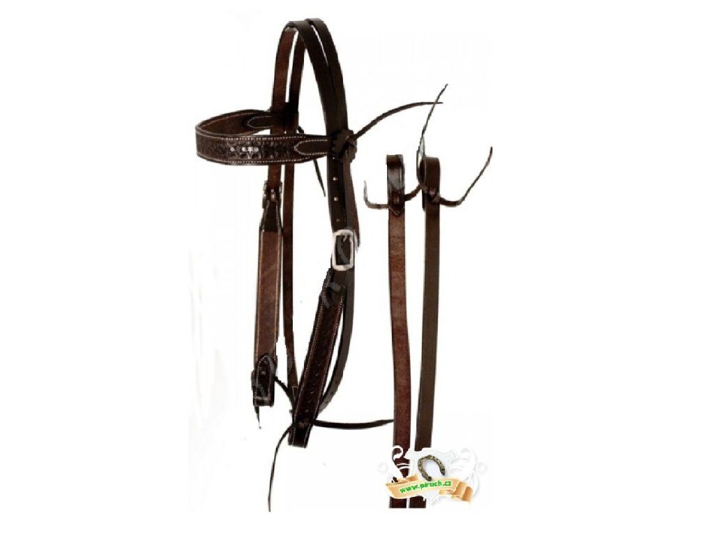 Westernová uzdečka, kožená i s otěžemi, zdobená na lícnici a čelence, vel. Full, barva středně hnědá, zapínání na lícnicích a otěžích pomocí nýtů, vel. ponyBuďte první, kdo napíše příspěvek k této položce.